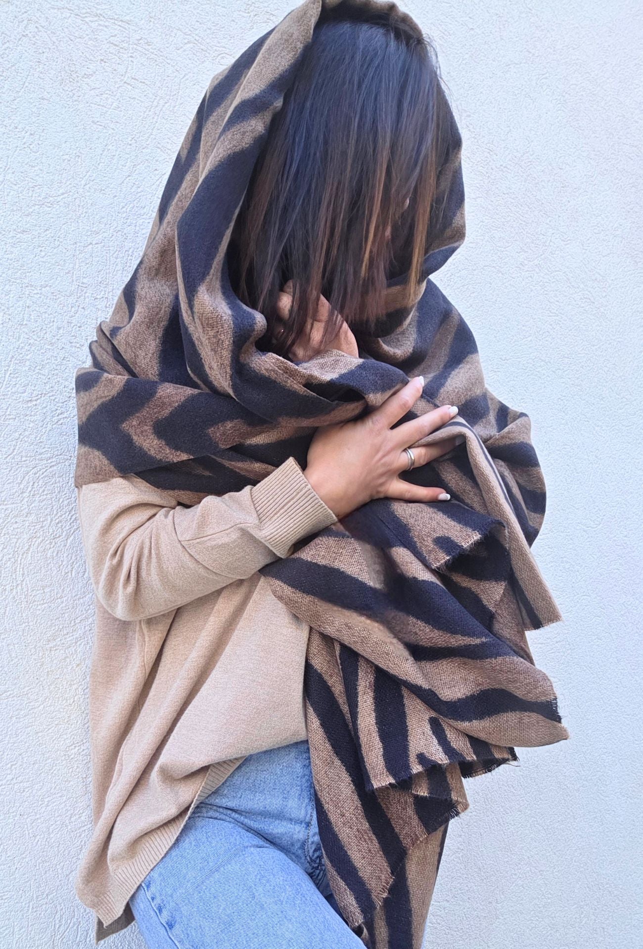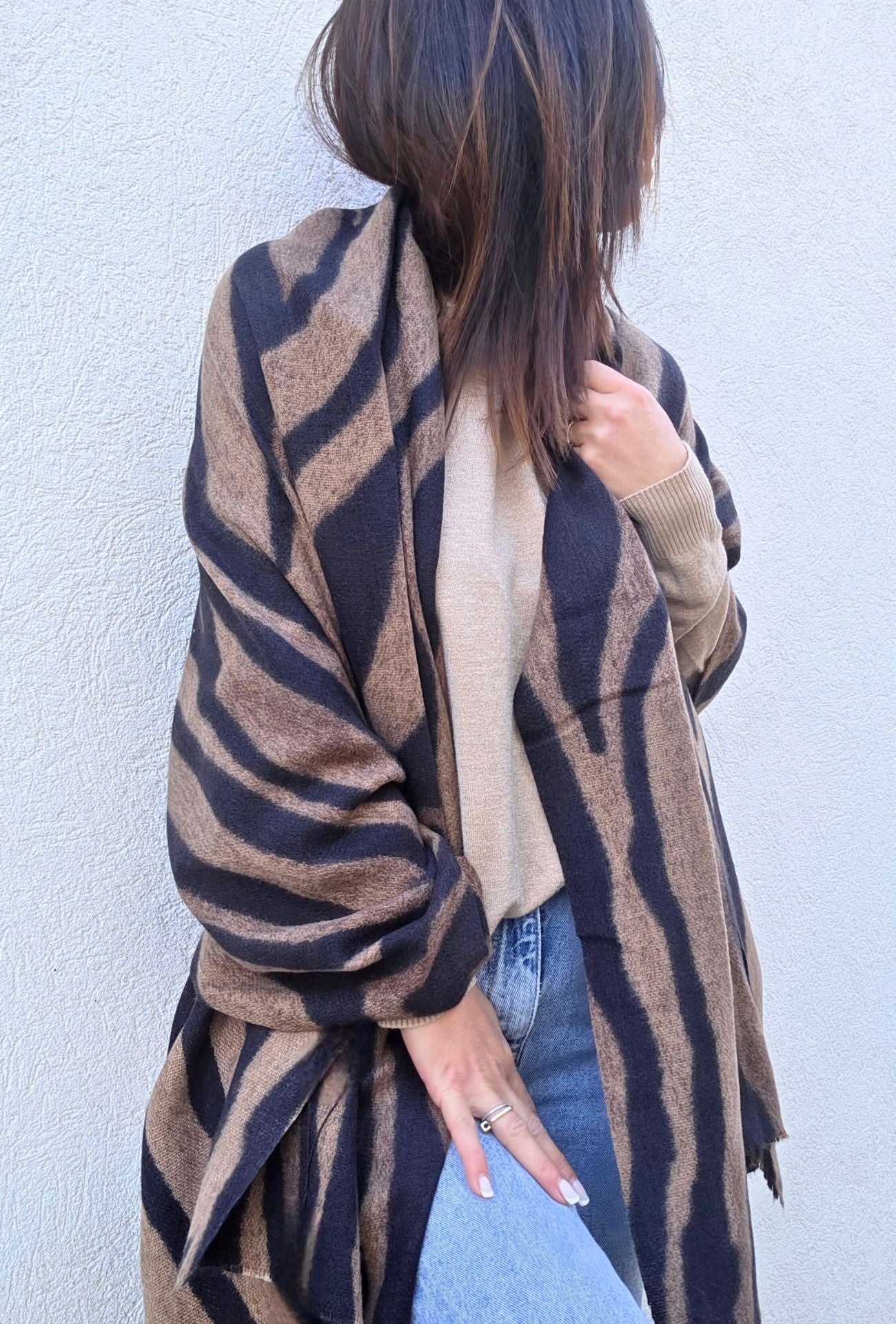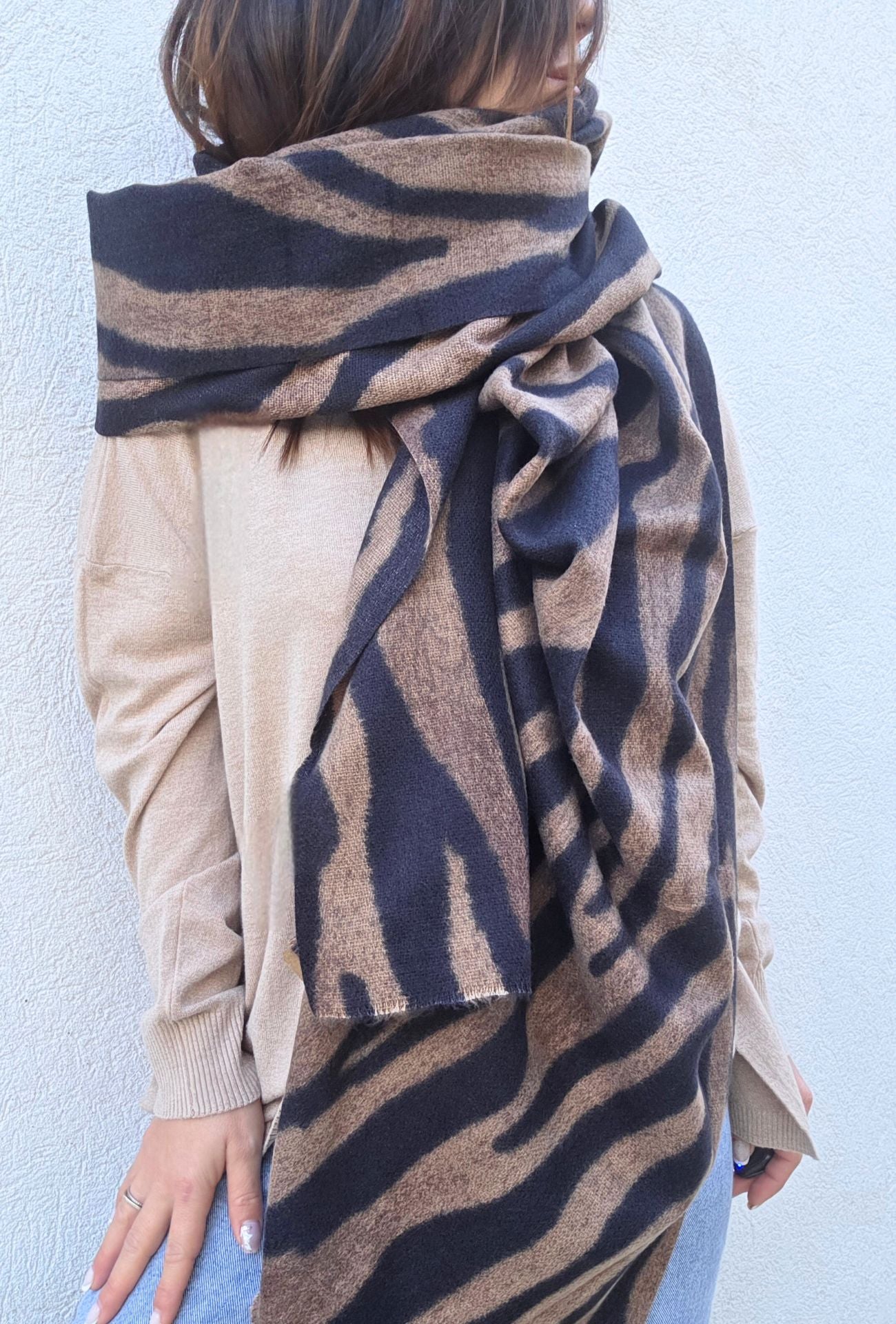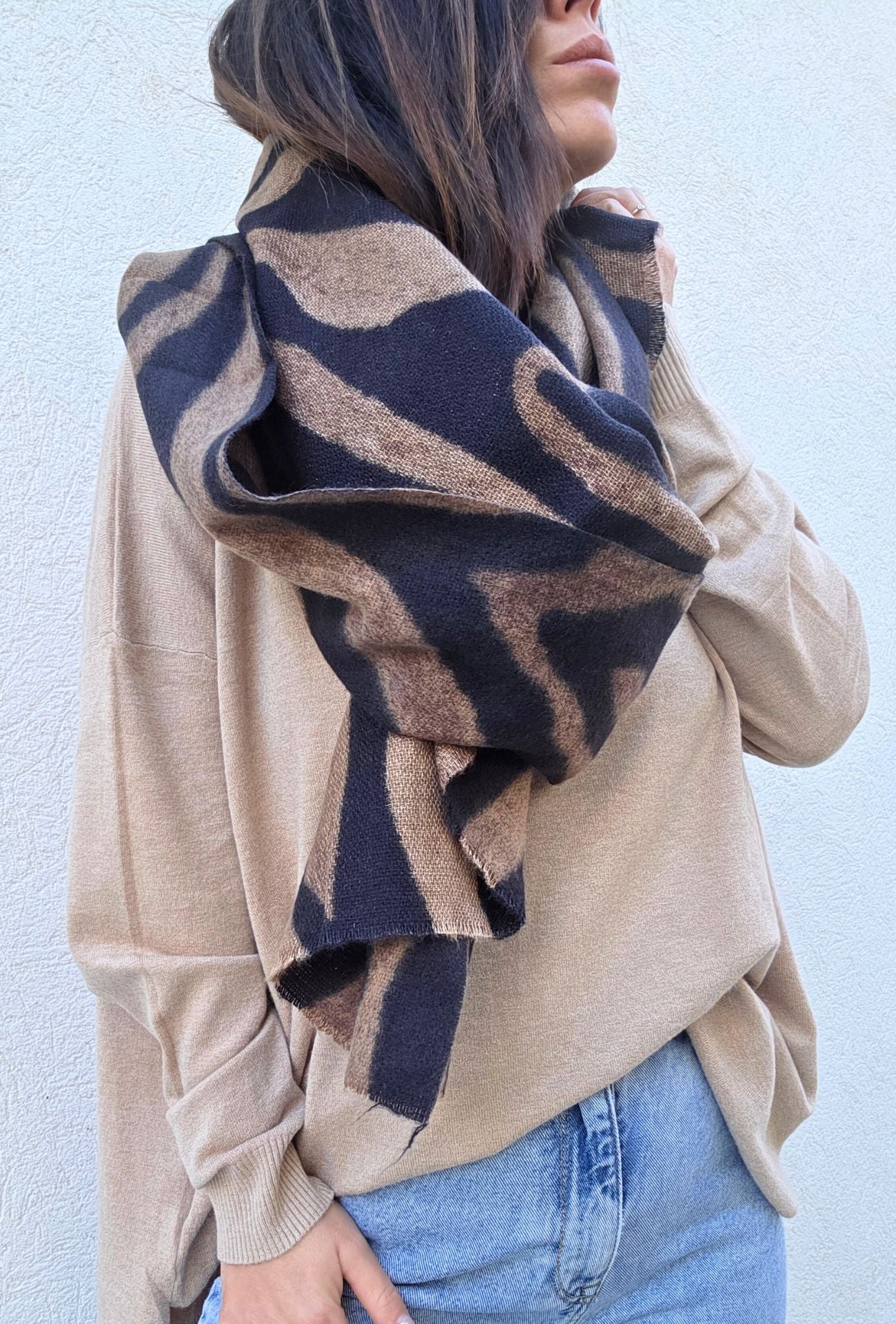 L’étole ZIZOU est la pièce maîtresse pour affronter l’hiver avec style. Sa grande taille permet de la porter aussi bien en écharpe douillette qu’en châle enveloppant. Son imprimé noir et marron façon zèbre revisité lui donne une touche audacieuse et ultra tendance, tout en restant facile à associer.